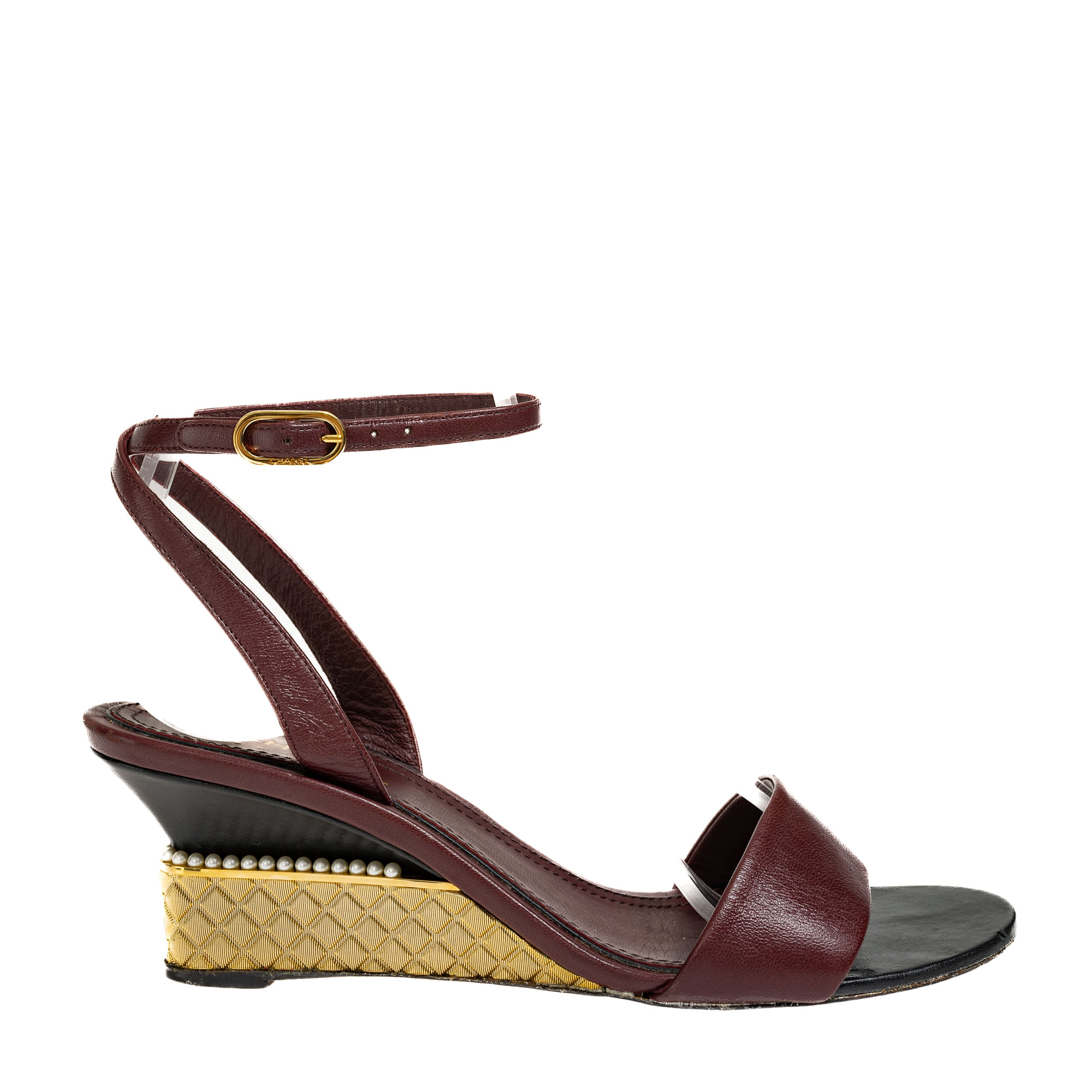 Sandália Chanel Anabela Pérola Couro Bordô